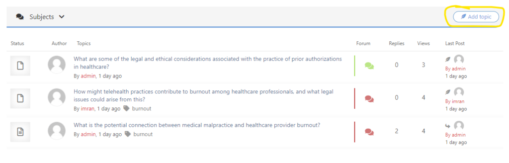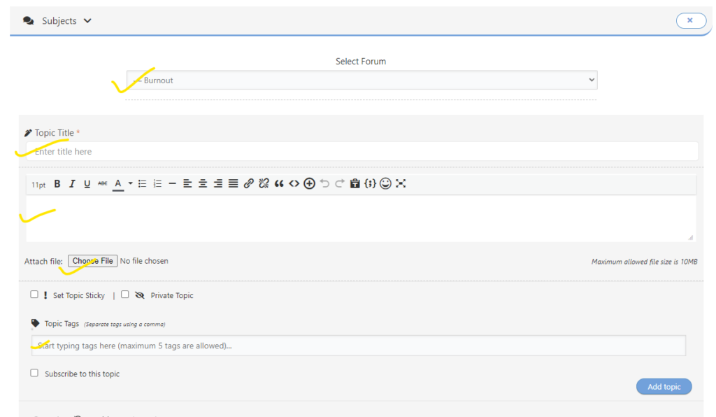 3. Select your subject from the drop-down menu. Then insert your Topic title and description. You can also insert a file and add a maximum of 5 tags. Finally, to submit the topic click “Add topic” at the bottom right side